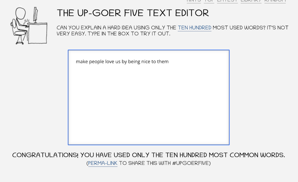 Screenshot of Up-Goer Five tool, showing “make people love us by being nice to them”. Tool says: “Congratulations! You have used only the ten hundred most common words.”