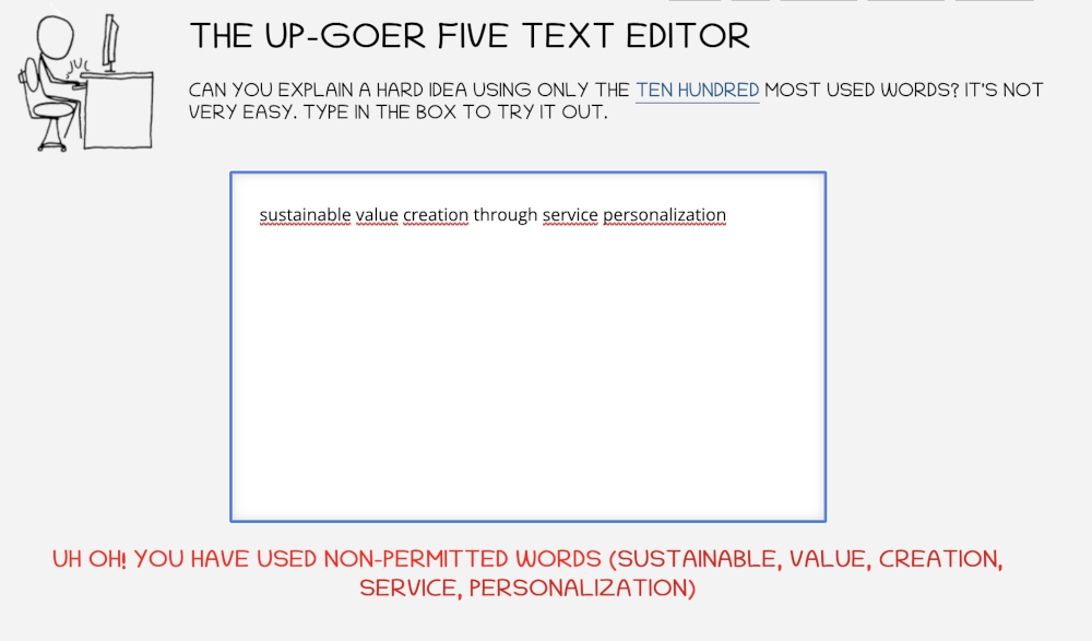 Screenshot of Up-Goer Five tool, showing “sustainable value creation through service personalization”. Tool says: “Uh oh! You have used non-permitted words (sustainable, value, creation, service, personalization)”